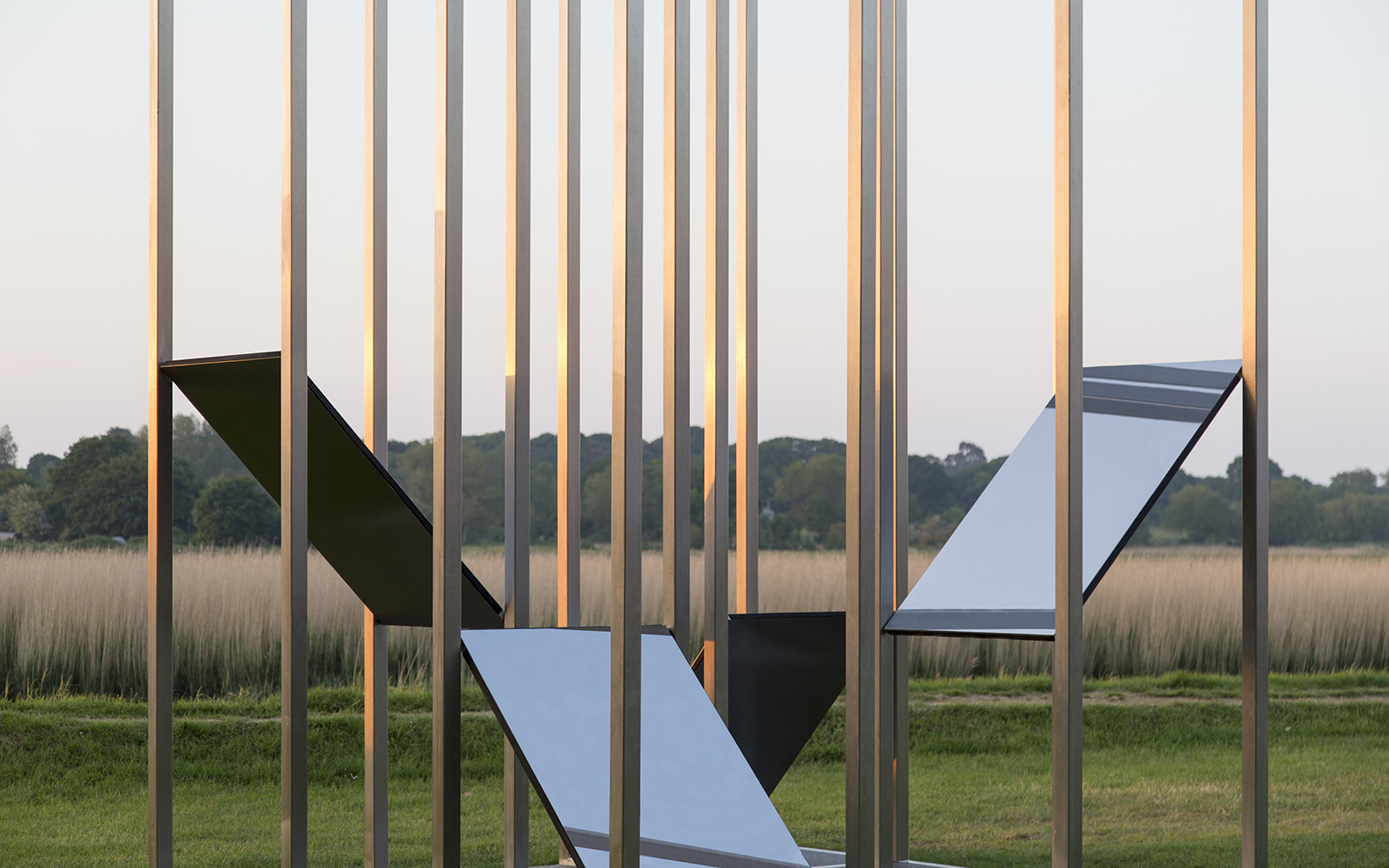 Standing tall on the Henry Moore Lawn holding an array of mirrors high above visitors’ heads, ‘Myriad’ reflects selected views over the surrounding landscape down to earth. A wide range of views is collected, from distant vistas across the marshes to new perspectives of the more immediate surroundings. These various viewpoints are reflected to form a multi-perspective collage that constantly shifts in relation to the visitors’ movement around and within the installation.
