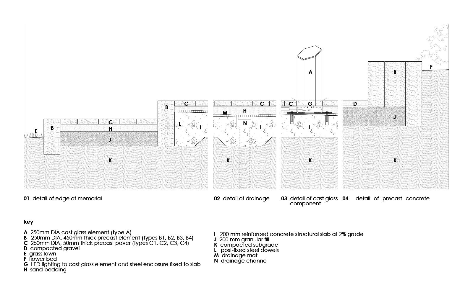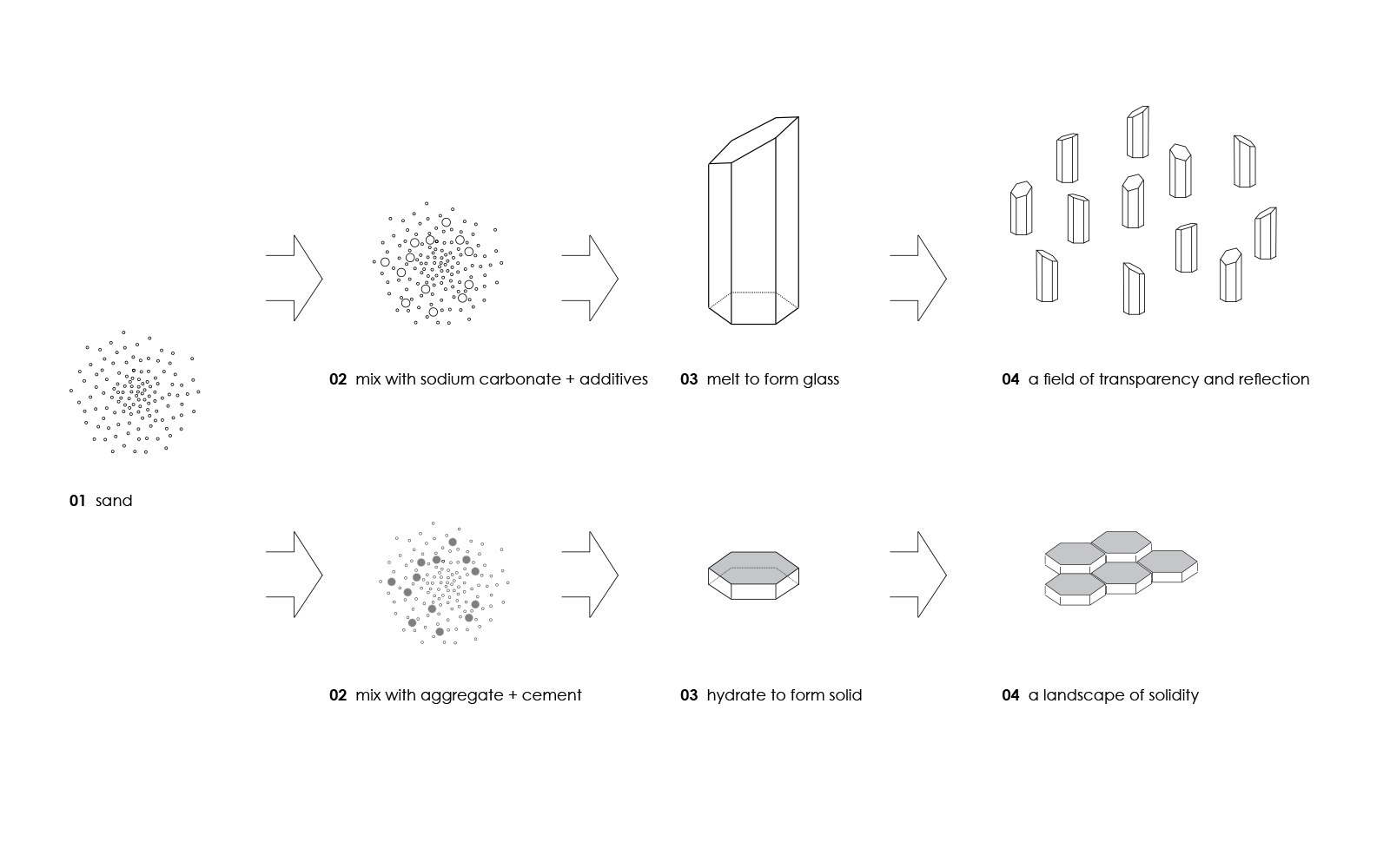 The process of solidifying sand will be undertaken through two parallel processes, one involving water and the other heat. A series of solid blocks will be formed by hydrating a mixture of sand, local aggregate and cement to form a vast interconnected landscape of individual elements, echoing the many families and individuals that have been impacted by the attacks. Rising from the central plateau is a cluster of sixty cast glass elements, marking the individual lives lost at Sousse and Bardo.